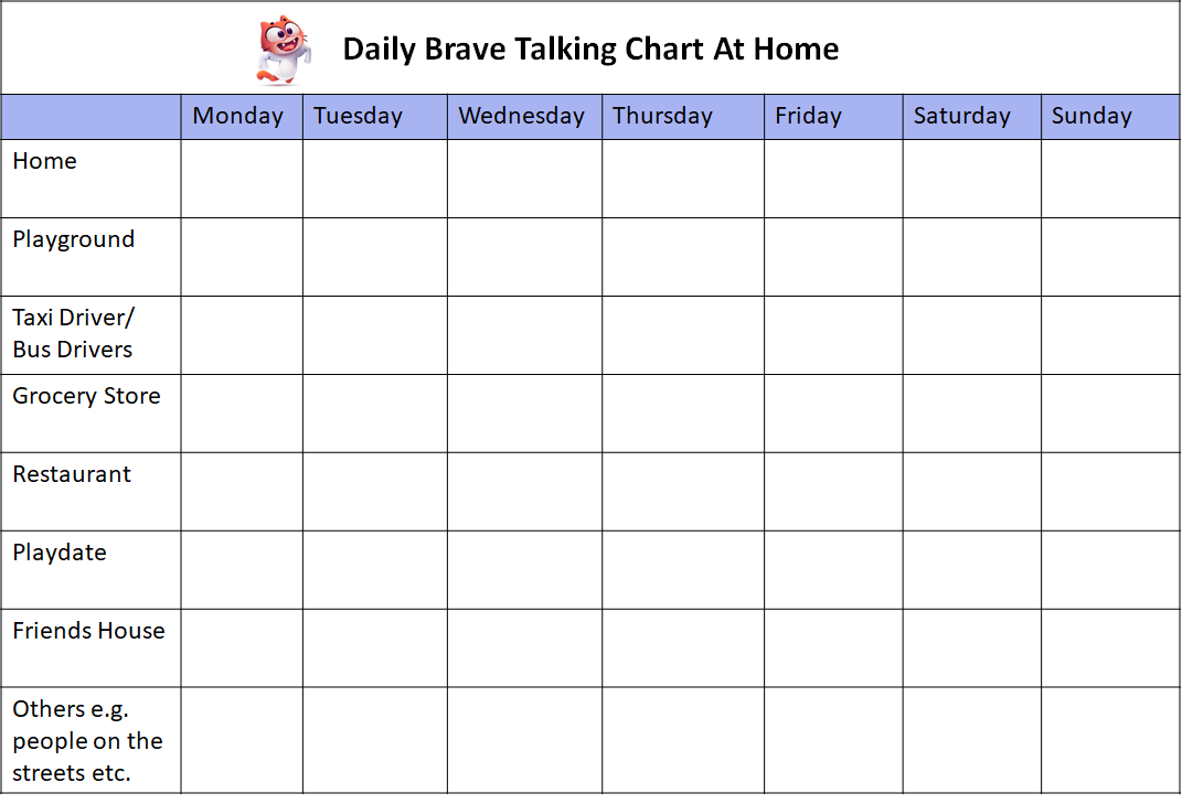 You can create your own brave talking chart one for home and one for school and put a star for the child every time they do brave talking and then give them a reward at the end of the week for a certain number of stars. Make sure the reward is achievable for the child.