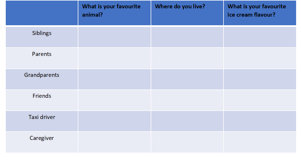 A sample of a questions chart which you could download. You could give them a star or a sticker for each task. As always remember to reflect after the child speaks and give them labelled praises.
